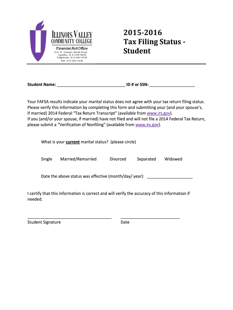 20152016 Tax Filing Status Student Names: ID # or SSN: Your FAFSA results indicate your marital status does not agree with your tax return filing status. Please verify this information by completing