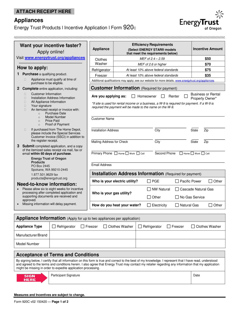 ATTACH RECEIPT HERE Appliances Energy Trust Products l Incentive Application l Form 920C Want your incentive faster? Apply online! Efficiency Requirements Appliance Visit www.energytrust.org/appliances