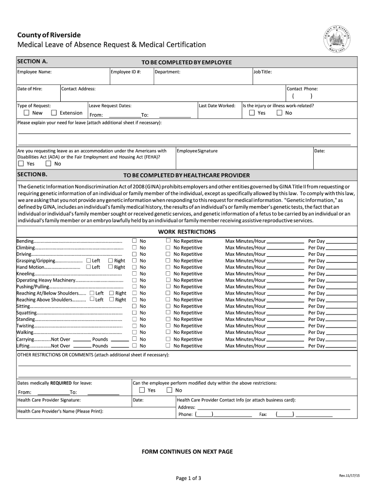 County of Riverside Medical Leave of Absence Request & Medical Certification SECTION A. TO BE COMPLETED BY EMPLOYEE Name: Employee ID #: Date of Hire: Job Title: Contact Address: Type of Request: