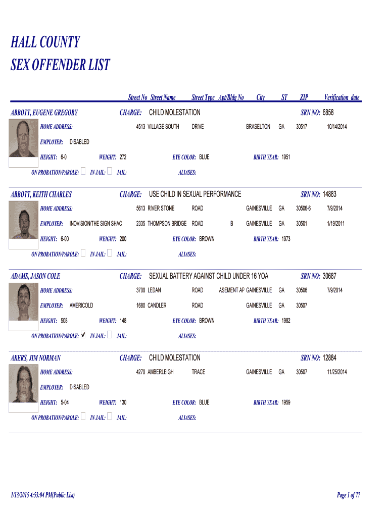 HALL COUNTY SEX OFFENDER LIST Street No Street Name CHARGE: ABBOTT, EUGENE GREGORY WEIGHT: 272 ON PROBATION/PAROLE: IN JAIL: JAIL: DRIVE Verification date BRADENTON GA 30517 10/14/2014 InVision/THE