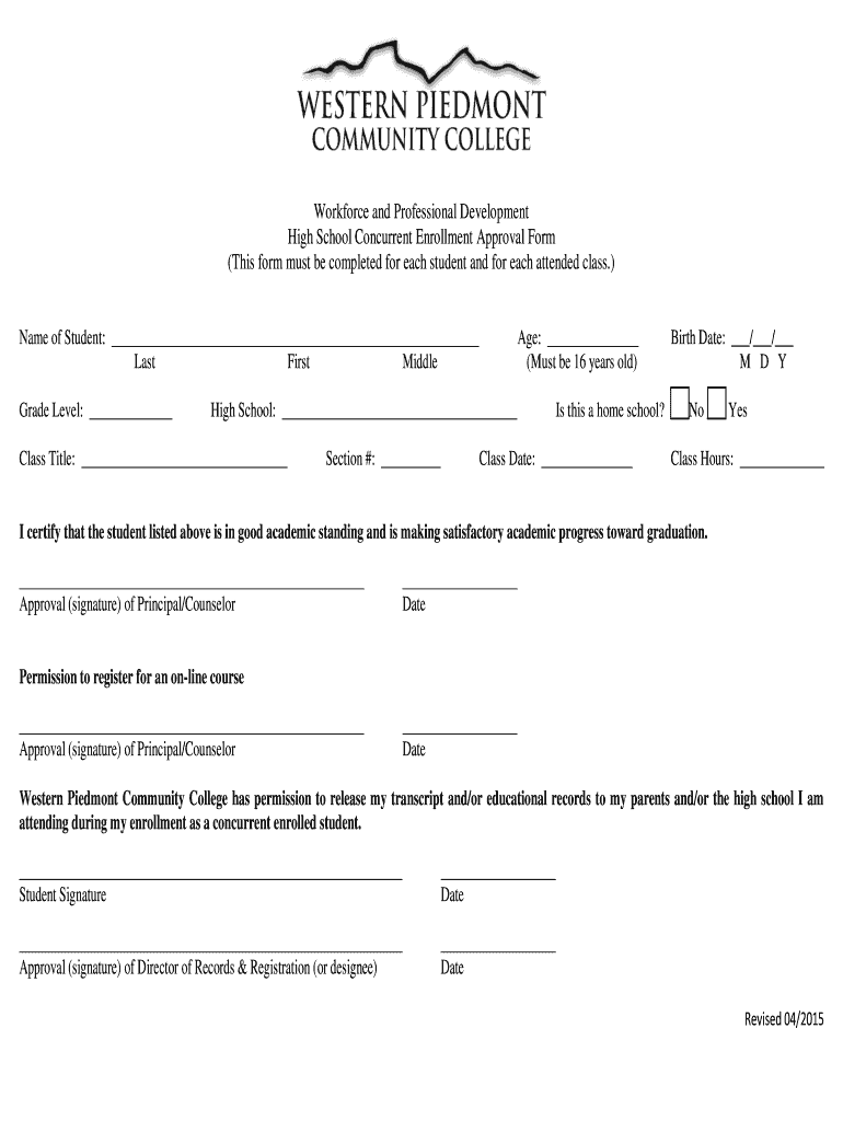 Workforce and Professional Development High School Concurrent Enrollment Approval Form (This form must be completed for each student and for each attended class.) Name of Student: Last Grade Level: