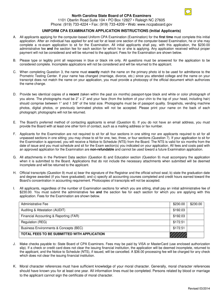 North Carolina State Board of CPA Examiners 1101 Oberlin Road Suite 104 PO Box 12827 Raleigh NC 27605 Phone: (919) 7334224 Fax: (919) 7334209 Web: www.nccpaboard.gov UNIFORM CPA EXAMINATION APPLICATION