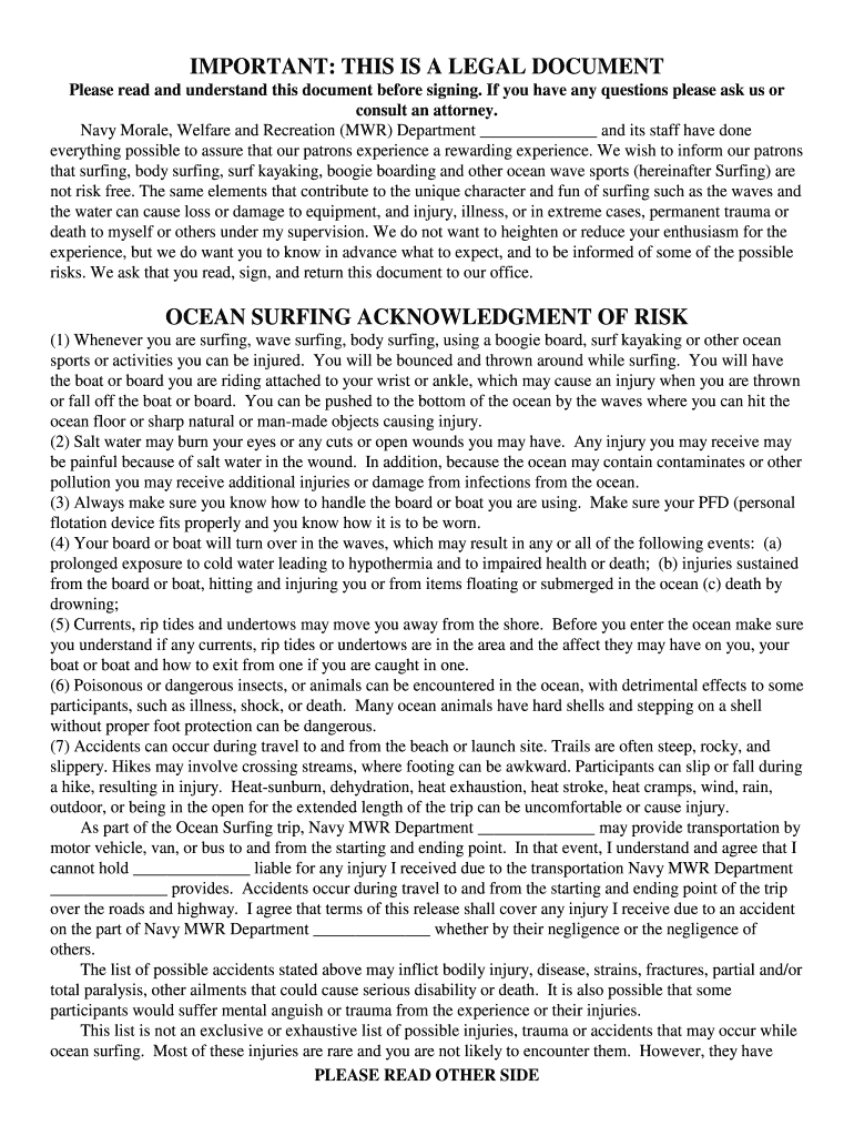 IMPORTANT: THIS IS A LEGAL DOCUMENT Please read and understand this document before signing. If you have any questions please ask us or consult an attorney. Navy Morale, Welfare and Recreation (MR)