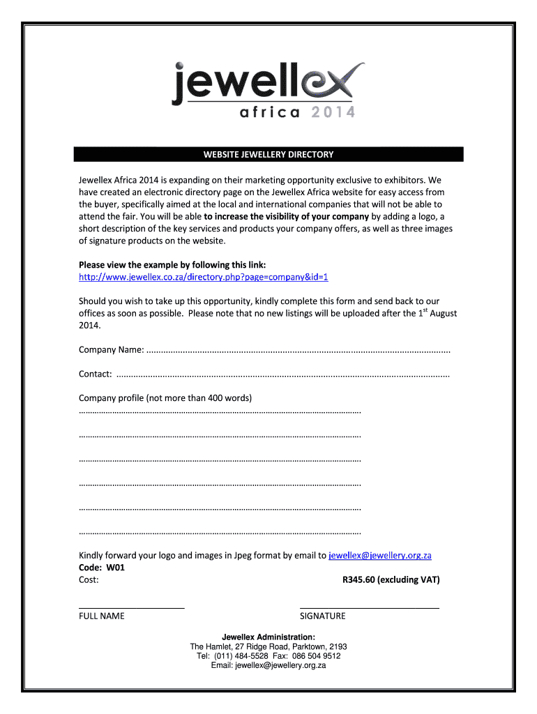 WEBSITE Jewelry DIRECTORY Jewell ex Africa 2014 is expanding on their marketing opportunity exclusive to exhibitors. We have created an electronic directory page on the Jewell ex Africa website for