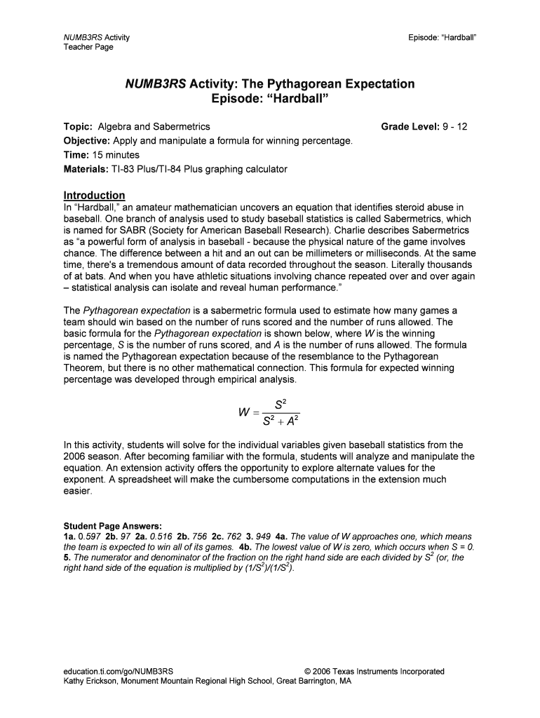 NUMB3RS Activity Teacher Page Episode: Hardball NUMB3RS Activity: The Pythagorean Expectation Episode: Hardball Topic: Algebra and Saber metrics Objective: Apply and manipulate a formula for winning