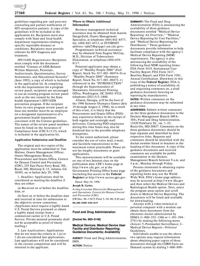 This document provides guidelines for pre- and post-test counseling for HIV-seropositive patients and details on the availability of guidance documents related to medical device reporting. It includes