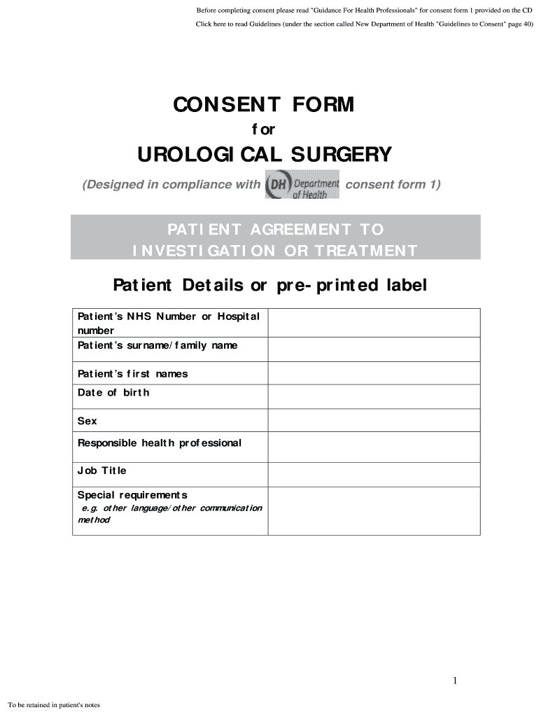 Method. CONSENT FORM for. UROLOGICAL SURGERY. (Designed in compliance with consent form 1). Rigid Cystoscopy and Bladder Distension ...