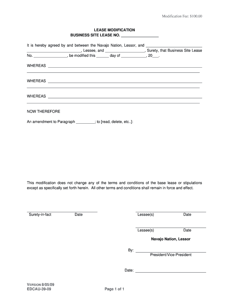 Modification Fee: $100.00 LEASE MODIFICATION BUSINESS SITE LEASE NO. It is hereby agreed by and between the Navajo Nation, Lessor, and, Lessee, and, Surety, that Business Site Lease No. , be modified