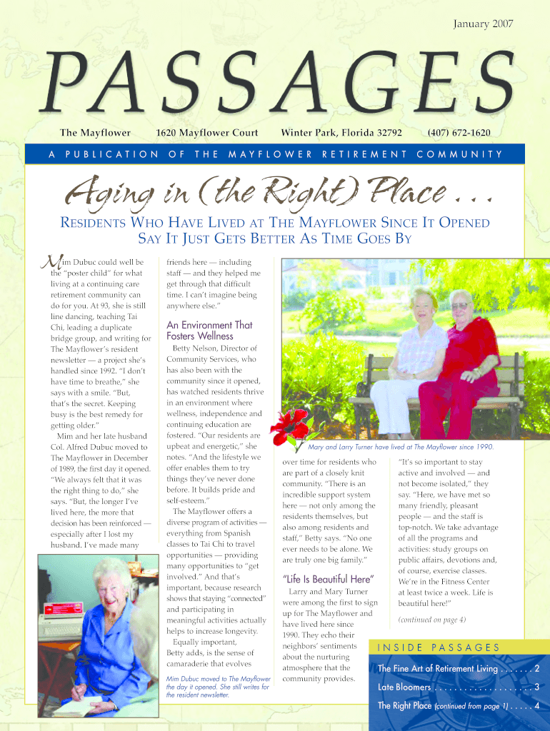 January 2007 The Mayflower A 1620 Mayflower Court P U B L I C A T I O N O F T H E Winter Park, Florida 32792 M A F L O W E R R E T I R E M E N T (407) 6721620 C O M M U N I T Y Aging in (the Right)