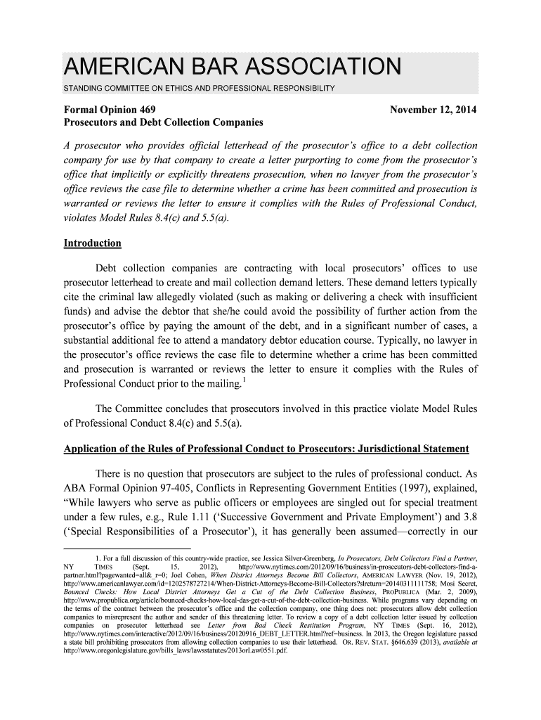 AMERICAN BAR ASSOCIATION STANDING COMMITTEE ON ETHICS AND PROFESSIONAL RESPONSIBILITY Formal Opinion 469 Prosecutors and Debt Collection Companies November 12, 2014, A prosecutor who provides official