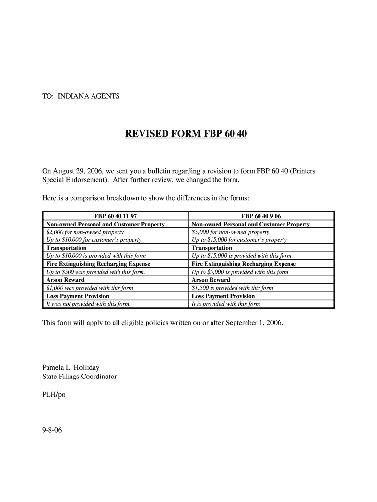 TO: INDIANA AGENTS REVISED FORM FBI 60 40 On August 29, 2006, we sent you a bulletin regarding a revision to form FBI 60 40 (Printers Special Endorsement). After further review, we changed the form.