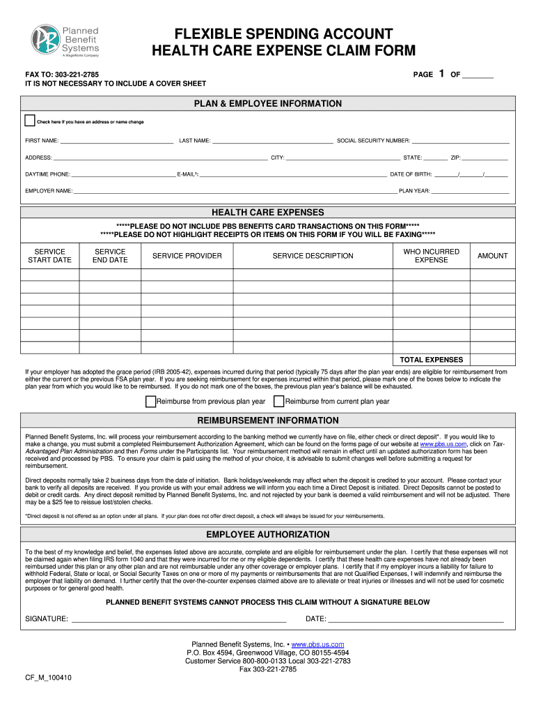 FLEXIBLE SPENDING ACCOUNT HEALTH CARE EXPENSE CLAIM FORM FAX TO: 3032212785 IT IS NOT NECESSARY TO INCLUDE A COVER SHEET PAGE 1 OF PLAN & EMPLOYEE INFORMATION Check here if you have an address or