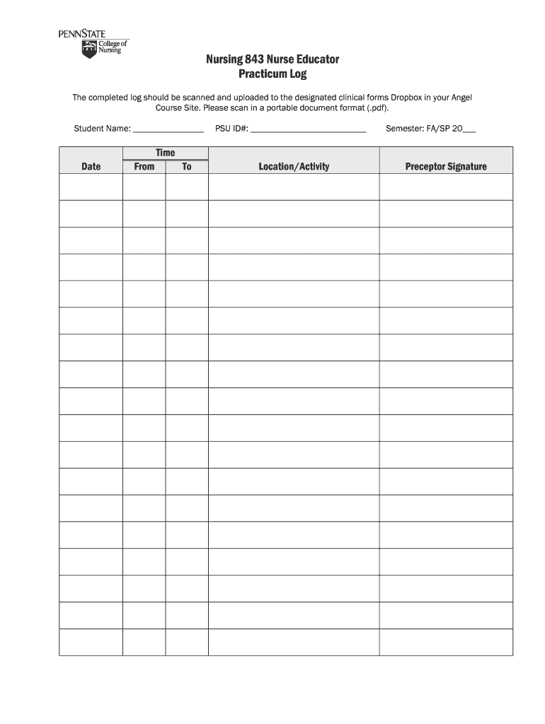Nursing 843 Nurse Educator Practicum Log The completed log should be scanned and uploaded to the designated clinical forms Dropbox in your Angel Course Site. Please scan in a portable document format