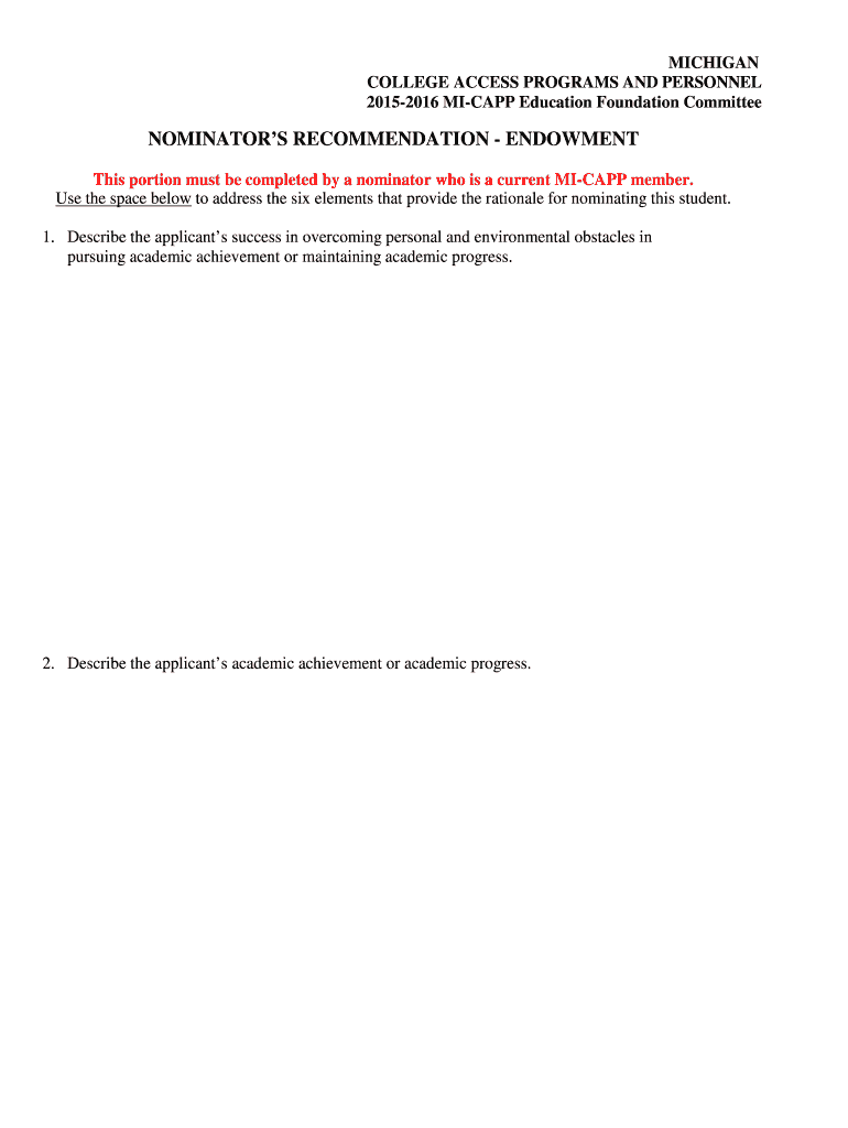 Get the free NOMINATORS RECOMMENDATION - ENDOWMENT - micapp