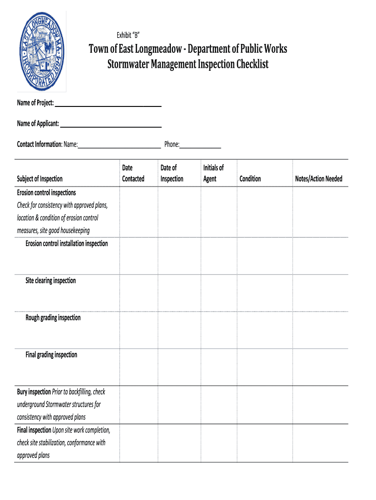 Exhibit B Town of East Long meadow Department of Public Works Stormwater Management Inspection Checklist Name of Project