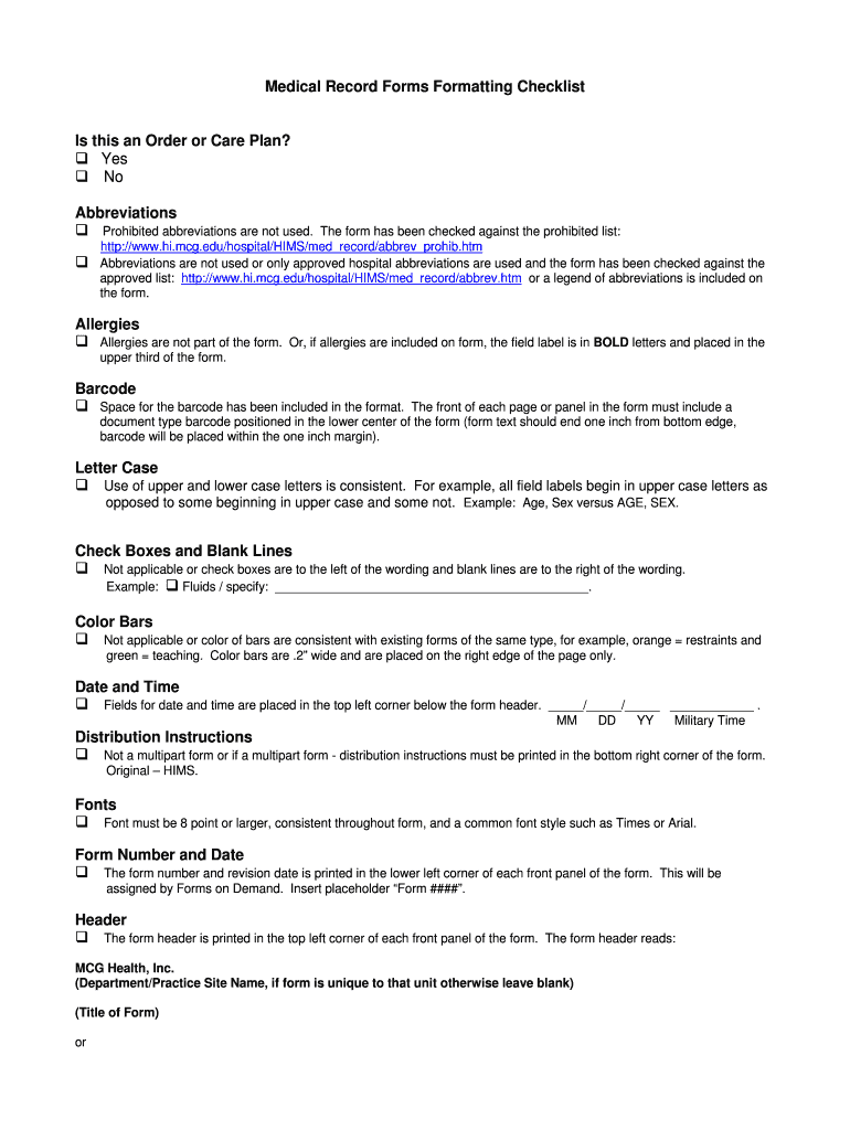 Medical Record Forms Formatting Checklist Is this an Order or Care Plan? Yes No Abbreviations Prohibited abbreviations are not used. The form has been checked against the prohibited list: http://www.hi.mcg.edu/hospital/HIMS/med