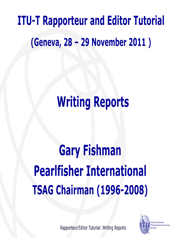 ITU Rapporteur and Editor Tutorial (Geneva, 28 29 November 2011)Writing Reports Gary Fishman Pearl fisher International TAG Chairman (19962008) Rapporteur/Editor Tutorial: Writing ReportsOverview