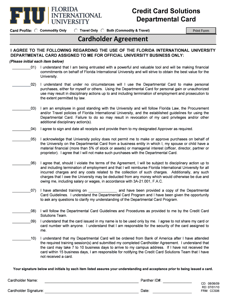 Credit Card Solutions Departmental Card Profile: Commodity Only Travel Both (Commodity & Travel) Print Form Cardholder Agreement I AGREE TO THE FOLLOWING REGARDING THE USE OF THE FLORIDA INTERNATIONAL