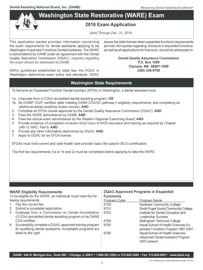 Dental Assisting National Board, Inc. (DAN) Measuring Dental Assisting Excellence Washington State Restorative (WARE) Exam 2016 Exam Application Valid Through Dec. 31, 2016 This application packet