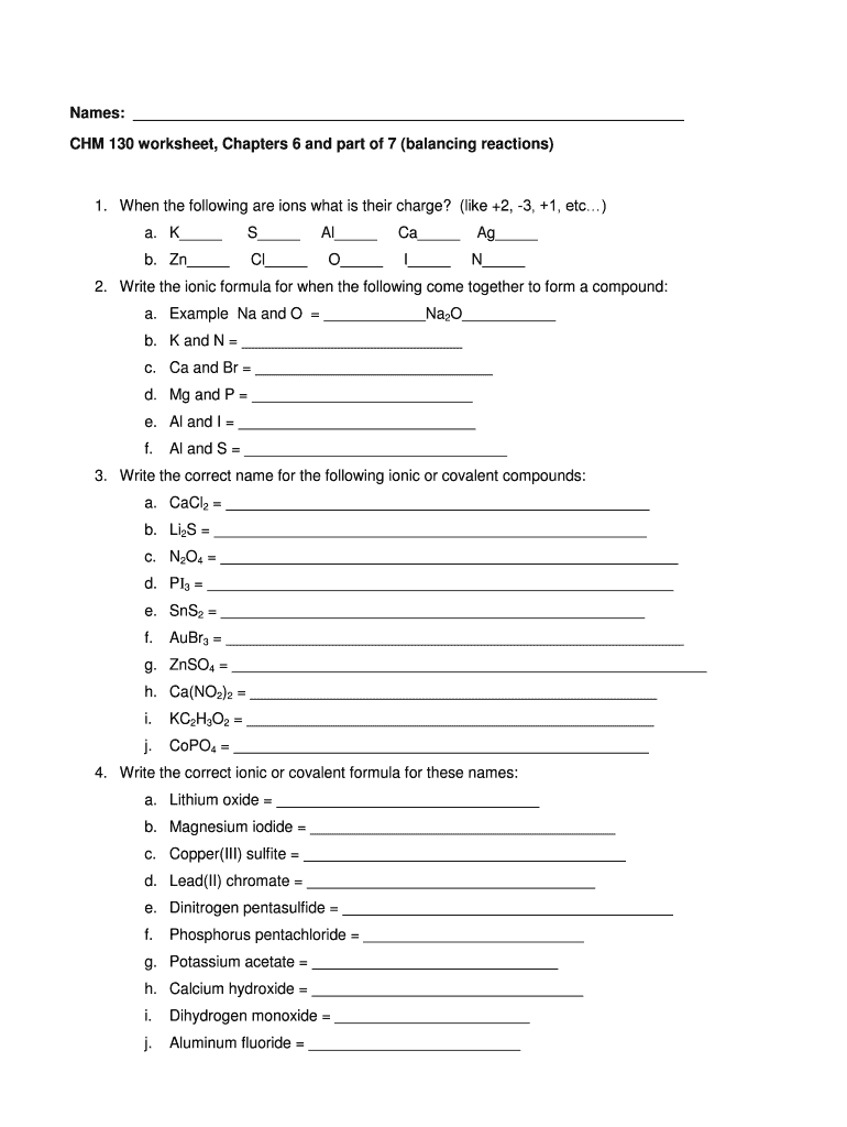 Names: CHM 130 worksheet, Chapters 6 and part of 7 (balancing reactions) 1. When the following are ions what is their charge? (like +2, 3, +1, etc) a. K S b. Zn Cl Al O Ca I Ag N 2. Write the ionic