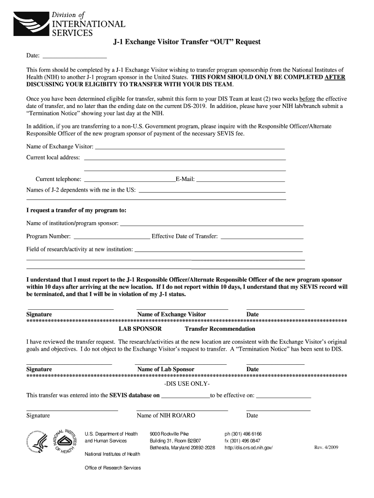 This form is for J-1 Exchange Visitors who wish to transfer their program sponsorship from the NIH to another J-1 program sponsor after determining eligibility with their DIS Team.