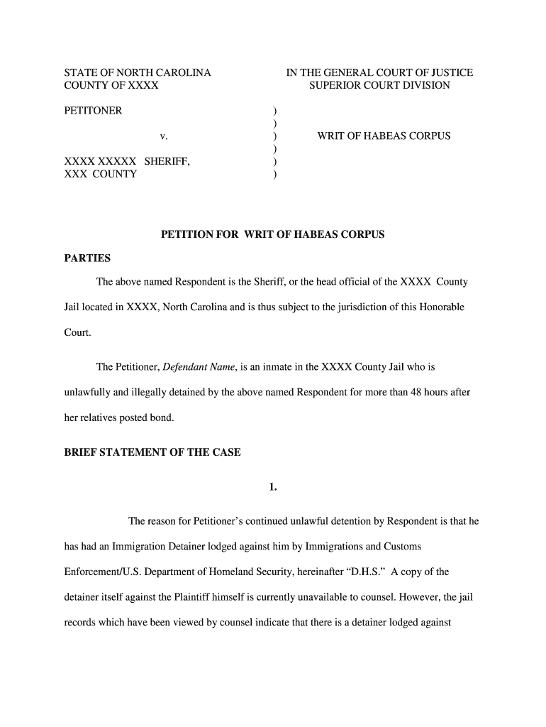 STATE OF NORTH CAROLINA COUNTY OF XXX PETITIONER v. XXX XXXIX SHERIFF, XXX COUNTY IN THE GENERAL COURT OF JUSTICE SUPERIOR COURT DIVISION)))))) WRIT OF HABEAS CORPUS PETITION FOR WRIT OF HABEAS CORPUS