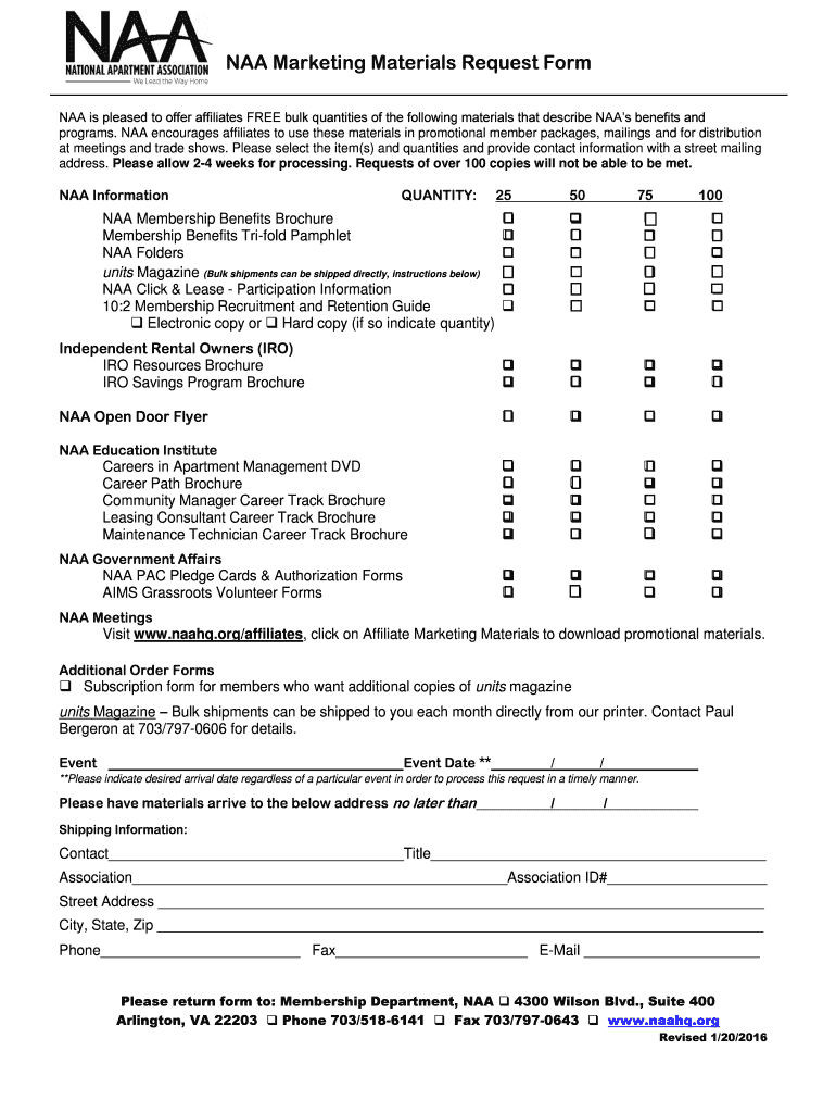 Get the free NAA Collateral Materials Order Form - naahqorg