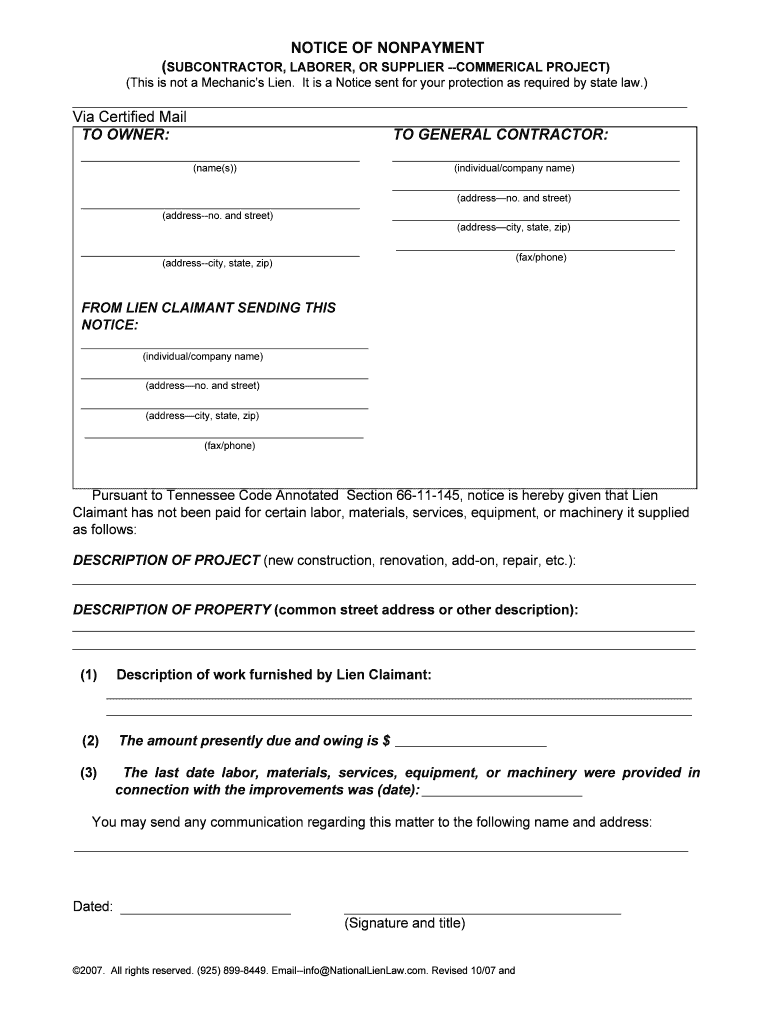 NOTICE OF NONPAYMENT (SUBCONTRACTOR, LABORER, OR SUPPLIER COMMERCIAL PROJECT) (This is not a Mechanics Lien. It is a Notice sent for your protection as required by state law.) Via Certified Mail TO