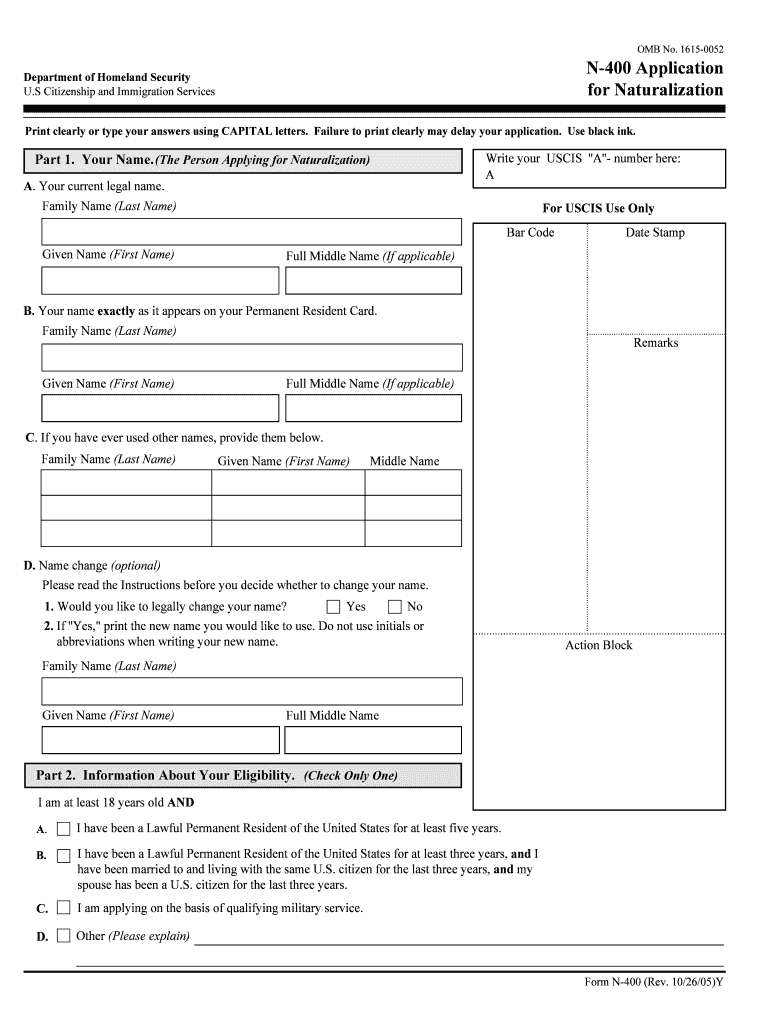 OMB No. 1615-0052 N-400 Application for Naturalization Department of Homeland Security U.S. Citizenship and Immigration Services Print clearly or type your answers using CAPITAL letters. Failure to