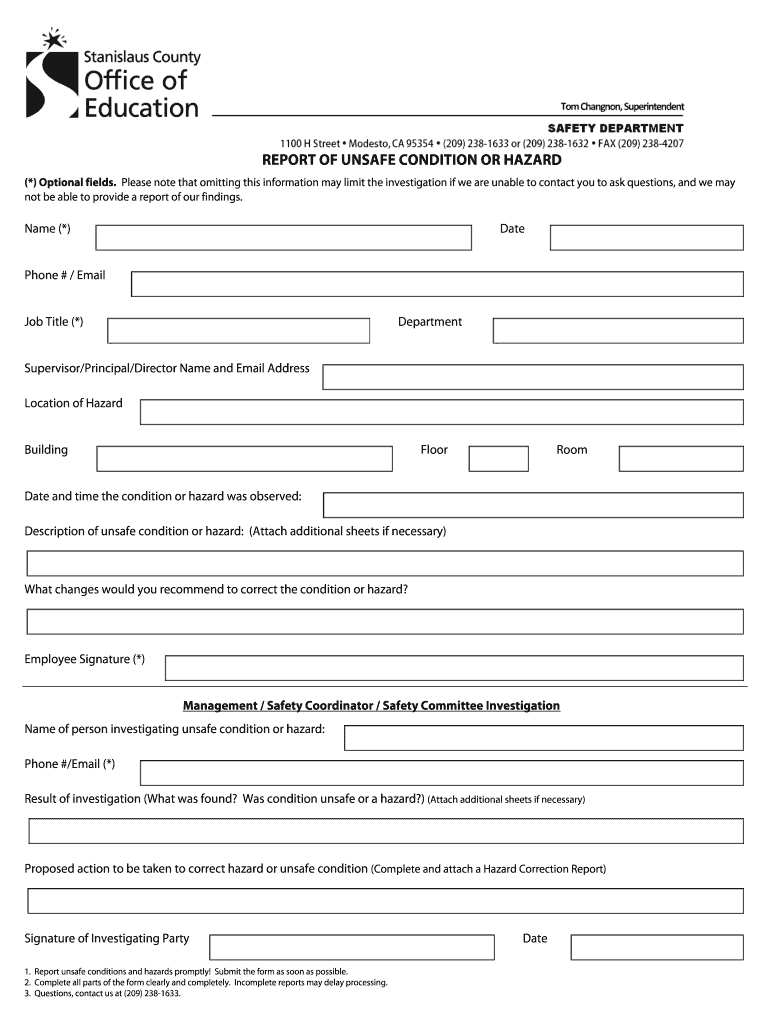 Get the free REPORT OF UNSAFE CONDITION OR HAZARD - stancoe