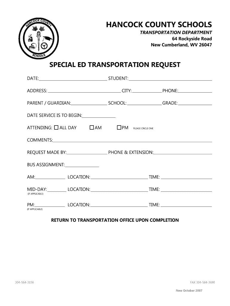 3045643156 faxes 3045643690 new October 2007 special ed transportation request. Date: student: address: city: phone: parent / guardian: school: grade: