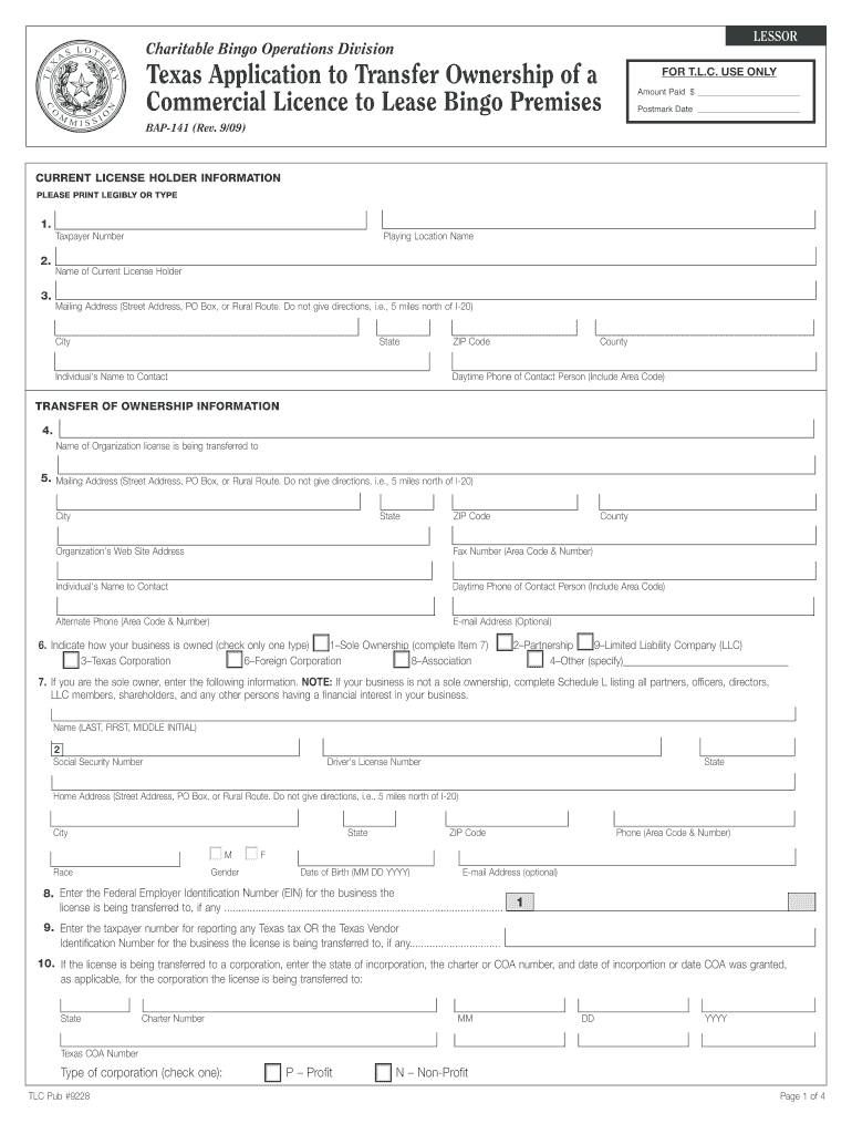 PRINT FORM RESET FORM LESSOR Charitable Bingo Operations Division Texas Application to Transfer Ownership of a Commercial License to Lease Bingo Premises FOR T.L.C. USE ONLY Amount Paid $ Postmark
