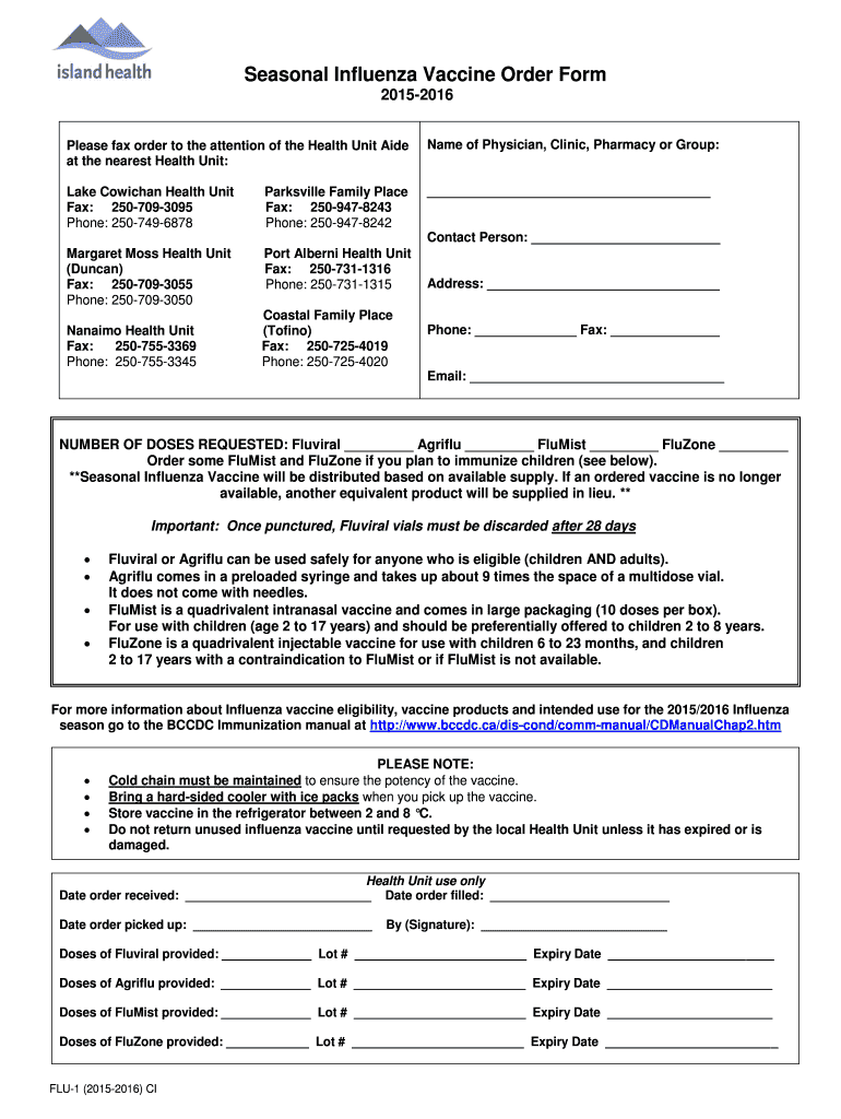 Seasonal Influenza Vaccine Order Form 20152016 Please fax order to the attention of the Health Unit Aide at the nearest Health Unit: Name of Physician, Clinic, Pharmacy or Group: Lake Conical Health