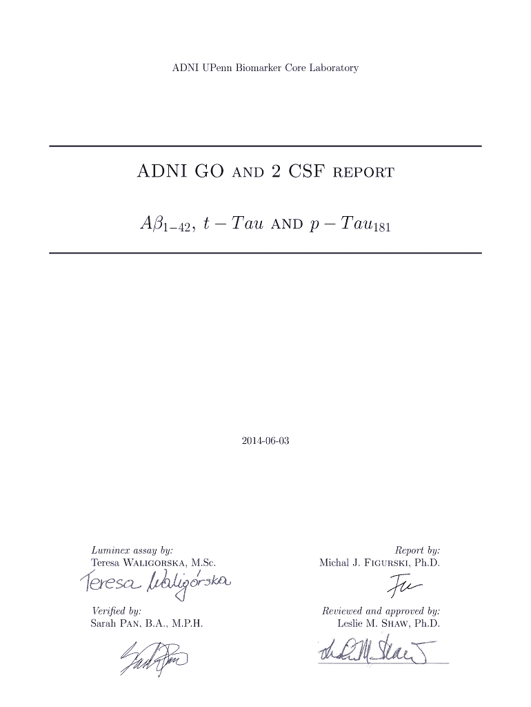 Get the free ADNI GO and 2 CSF report A 42 t Tau and p Tau181 - adni bitbucket