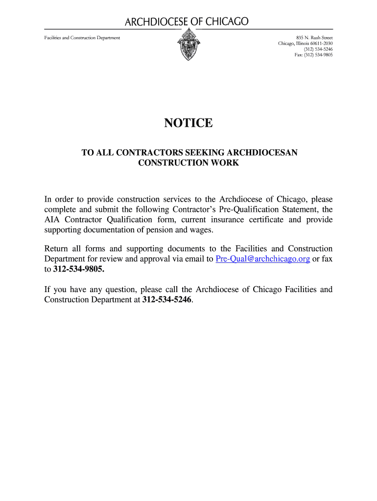 Facilities and Construction Department 835 N. Rush Street Chicago, Illinois 606112030 (312) 5345246 Fax: (312) 5349805 NOTICE TO ALL CONTRACTORS SEEKING ARCHDIOCESAN CONSTRUCTION WORK In order to