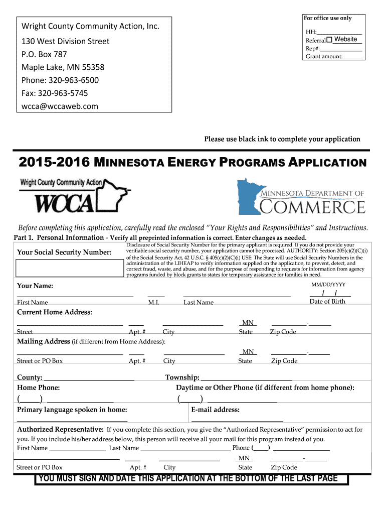 For office use only Wright County Community Action, Inc. HH: Website Referral Rep#: Grant amount: 130 West Division Street P.O. Box 787 Maple Lake, MN 55358 Phone: 3209636500 Fax: 3209635745 CCA wccaweb.com