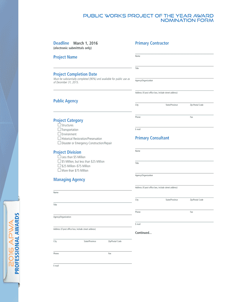 Deadline March 1, 2016, Primary Contractor (electronic submittals only) Project Name Title Project Completion Date Must be substantially completed (90%) and available for public use as of December