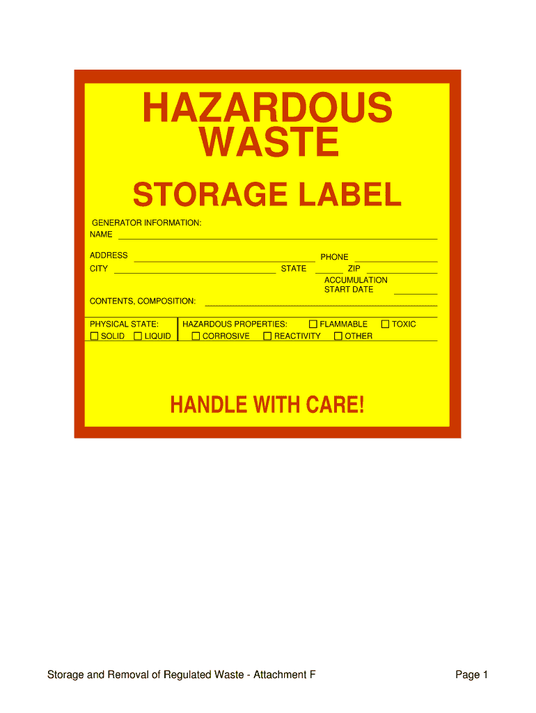 Instructions HAZARDOUS WASTE STORAGE LABEL GENERATOR INFORMATION: NAME ADDRESS CITY STATE PHONE ZIP ACCUMULATION START DATE CONTENTS, COMPOSITION: PHYSICAL STATE: SOLID LIQUID HAZARDOUS PROPERTIES: