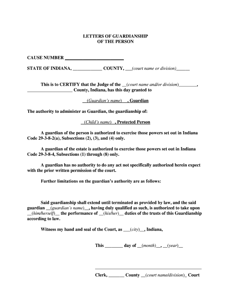 LETTERS OF GUARDIANSHIP OF THE PERSON CAUSE NUMBER STATE OF INDIANA, COUNTY, (court name or division) This is to CERTIFY that the Judge of the (court name and/or division), County, Indiana, has this