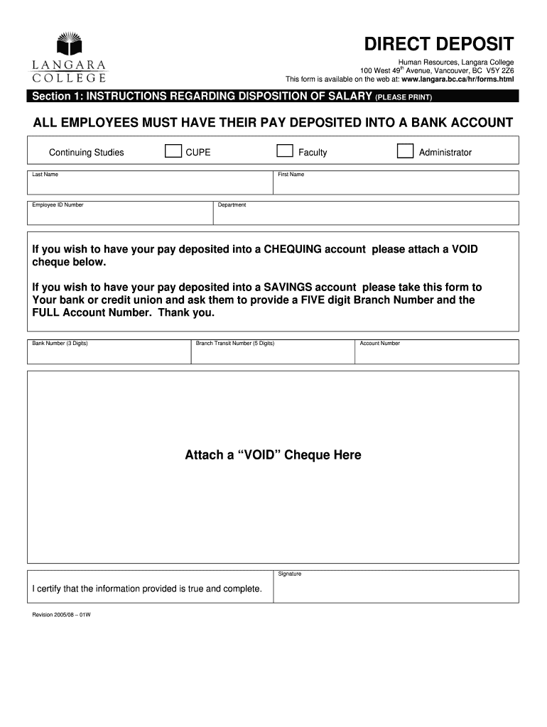 DIRECT DEPOSIT Human Resources, Angara College TH 100 West 49 Avenue, Vancouver, BC V5Y 2Z6 This form is available on the web at: www.langara.bc.ca/hr/forms.html Section 1: INSTRUCTIONS REGARDING