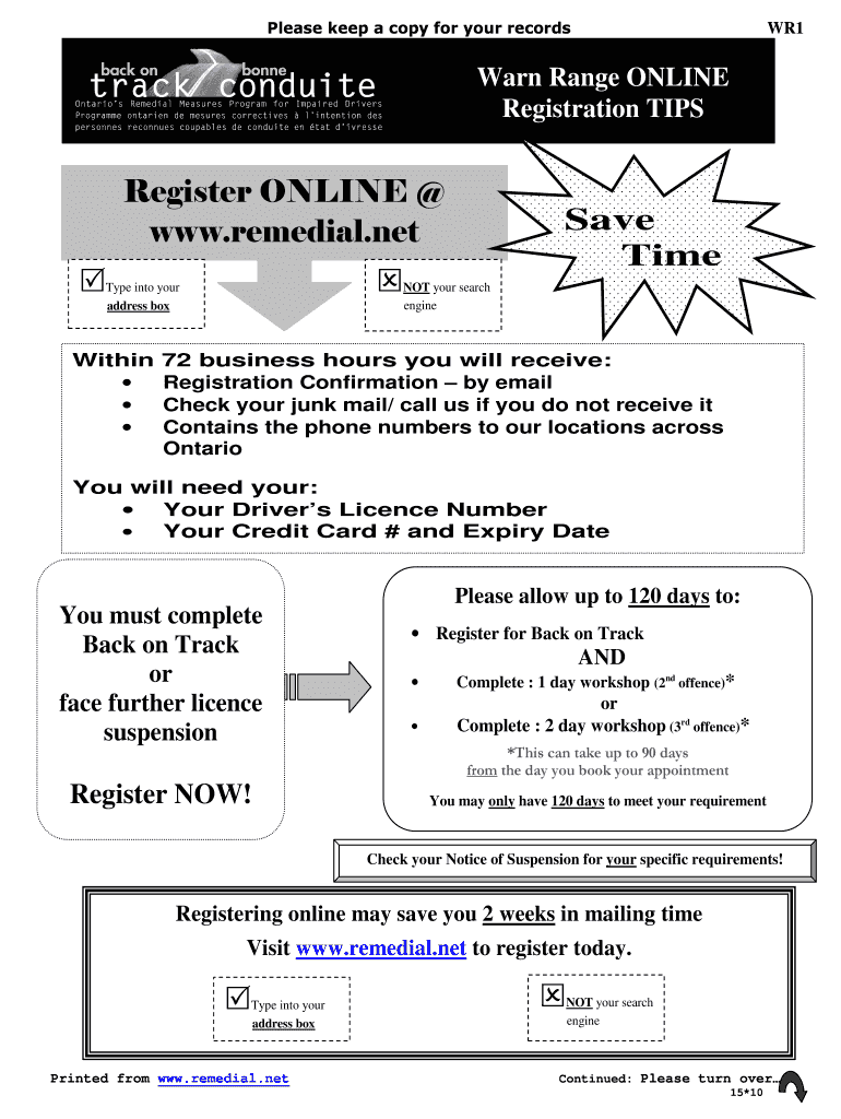 Please keep a copy for your records WR1 Warn Range ONLINE Registration TIPS Register ONLINE www.remedial.net Type into your address box Within Save Time NOT your search engine 72 business hours you