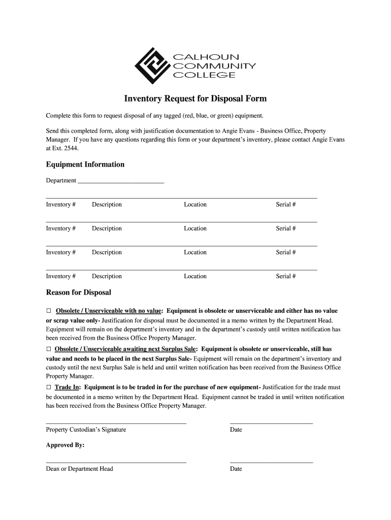 Inventory Request for Disposal Form Complete this form to request disposal of any tagged (red, blue, or green) equipment. Send this completed form, along with justification documentation to Angie