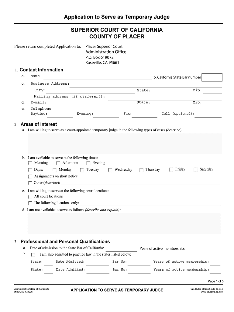 Print Form Application to Serve as Temporary Judge SUPERIOR COURT OF CALIFORNIA COUNTY OF PLACER Please return completed Application to: Placer Superior Court Administration Office P.O. Box 619072
