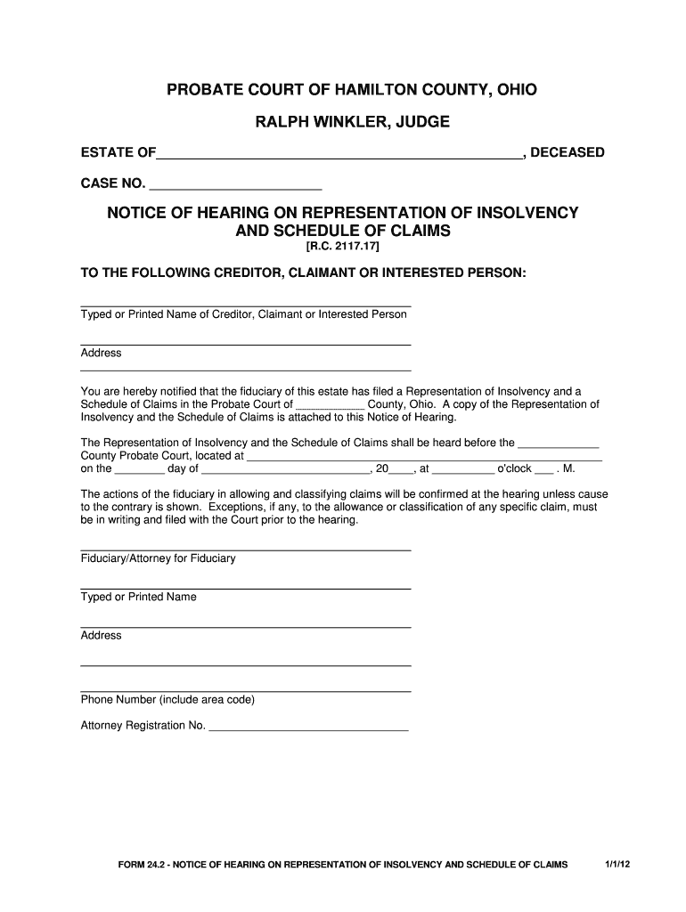 PROBATE COURT OF HAMILTON COUNTY, OHIO RALPH WINKLER, JUDGE ESTATE OF, DECEASED CASE NO. NOTICE OF HEARING ON REPRESENTATION OF INSOLVENCY AND SCHEDULE OF CLAIMS R.C. 2117.17 TO THE FOLLOWING CREDITOR,