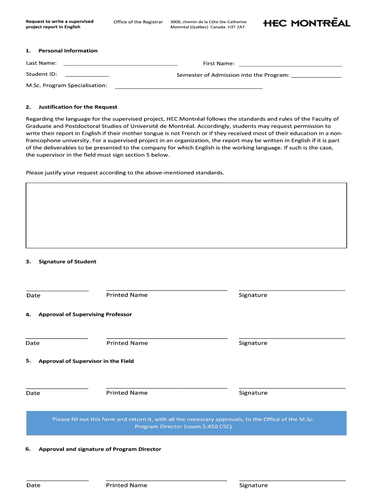 Request to write a supervised project report in English 1. Office of the Registrar 3000, chem in DE la CteSteCatherine Montreal (Quebec) Canada H3T 2A7 Personal Information Last Name: Student ID:
