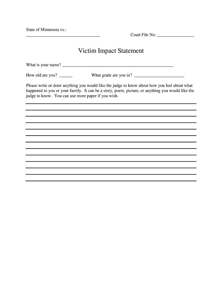 State of Minnesota vs.: Court File No: Victim Impact Statement What is your name? How old are you? What grade are you in? Please write or draw anything you would like the judge to know about how you