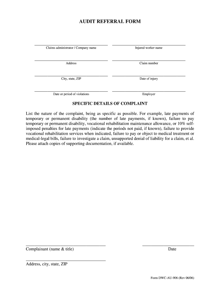 SAVE PRINT CLEAR AUDIT REFERRAL FORM Claims administrator / Company name Injured worker name Address Claim number City, state, ZIP Date of injury Date or period of violations Employer SPECIFIC DETAILS