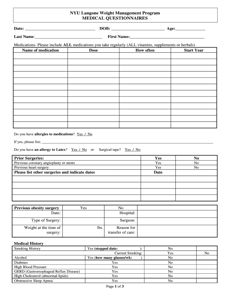 NYU Lang one Weight Management Program MEDICAL QUESTIONNAIRES Date: DOB: Age: Last Name: First Name: Medications Please include ALL medications you take regularly (ALL vitamins, supplements or herbals)
