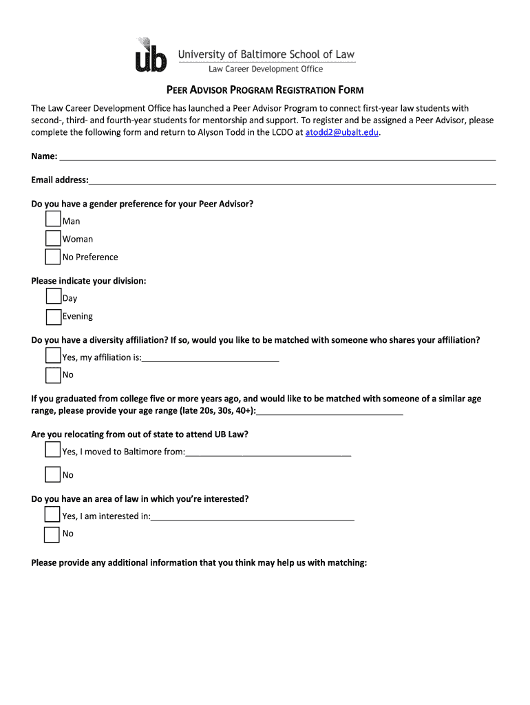 PEER ADVISOR PROGRAM REGISTRATION FORM. The Law Career Development Office has launched a Peer Advisor Program to connect first year law students with.