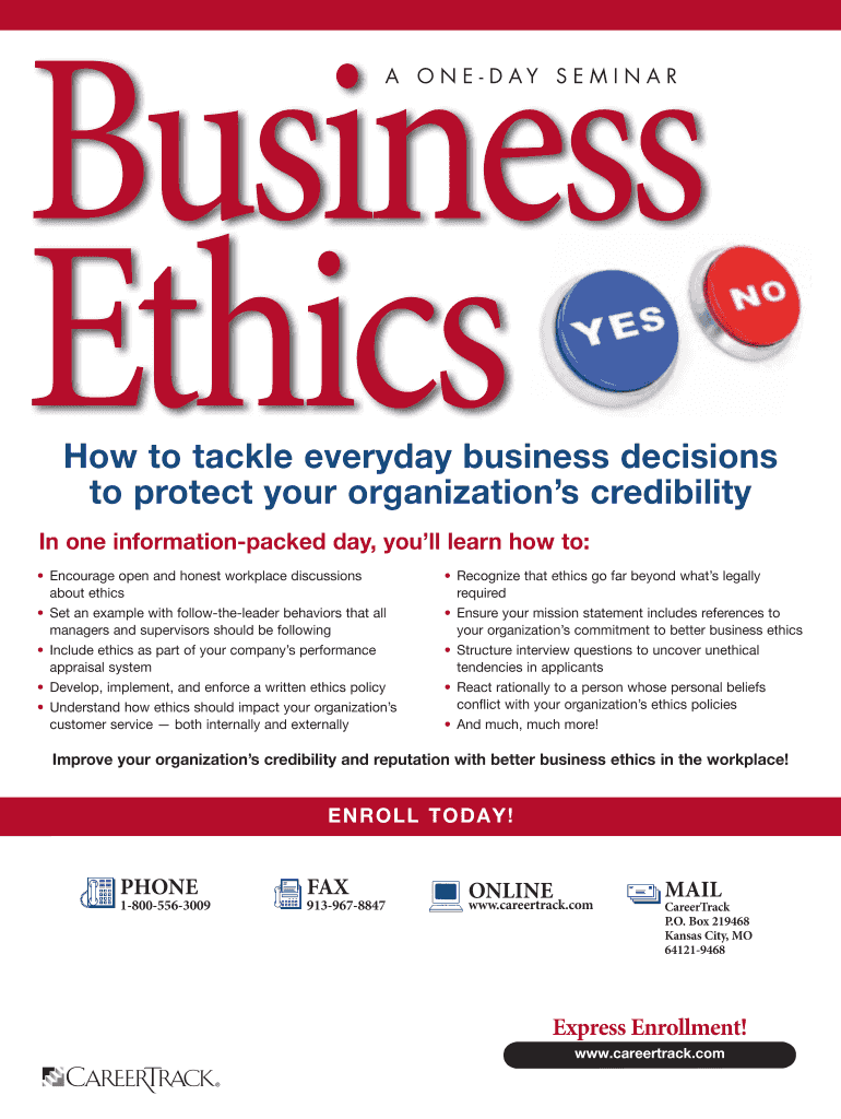 Business Ethics A O N E D A S E M I N A R How to tackle everyday business decisions to protect your organizations credibility In one information packed day, you'll learn how to: Encourage open and